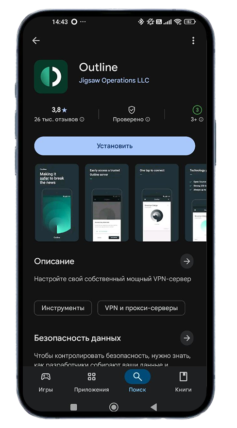 Откройте [страницу](https://play.google.com/store/apps/details?id=org.outline.android.client) в Google Play и установите приложение Outline