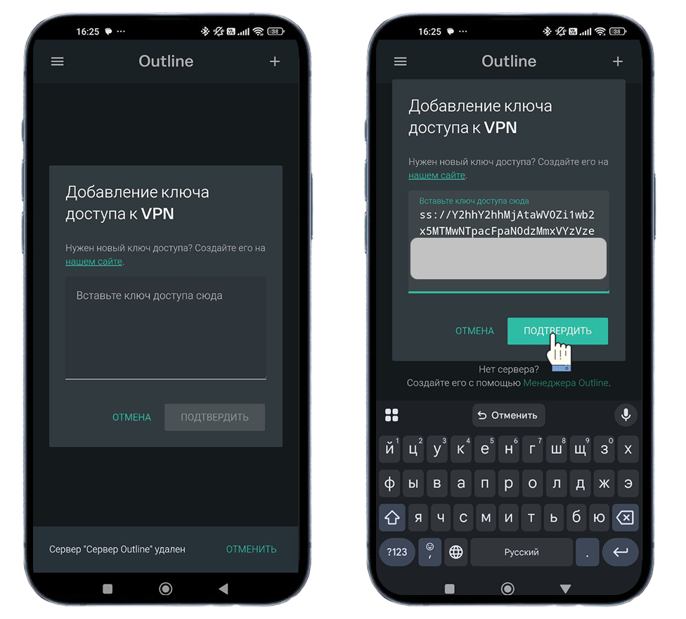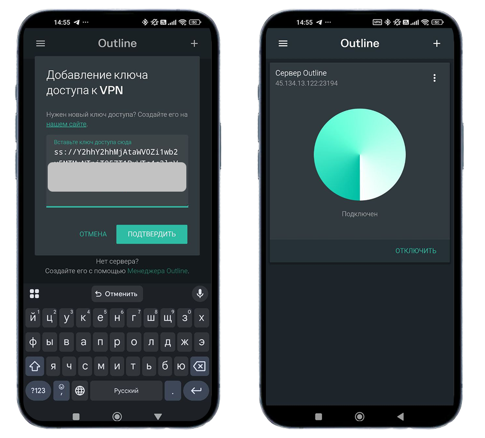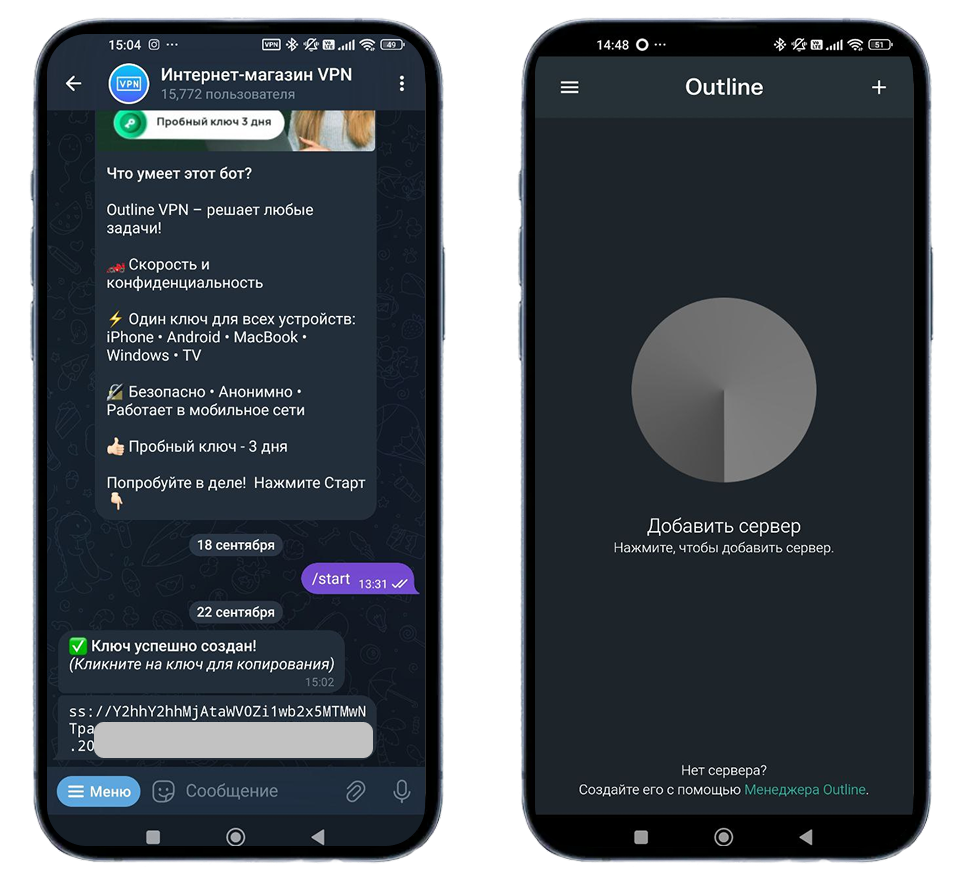 **Подсказка:** бесплатный ключ можно получить в Telegram-боте [@OutVPNBuy\_bot](https://t.me/OutVPNBuy_bot?start=wiki-podkluchenie-outline). Бесплатный пробный ключ действует 3 дня.